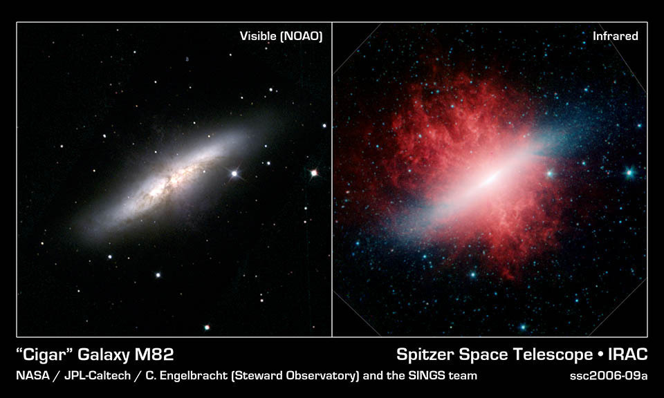Optional Websites: Compare the visible light view of the "Cigar galaxy" (M82) with the infrared view taken by NASA's Spitzer Space Telescope. What can you see in the white-light picture that isn't visible in the infrared? What can you see in the infrared that isn't visible in the white-light picture? How does our theory of light emission explain the difference? What do the differences tell you about the composition, shape, and temperatures of this galaxy?